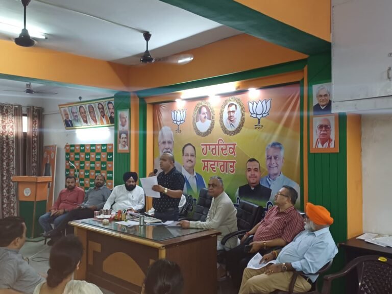 जालंधर : भारतीय जनता पार्टी जिला जालंधर के अध्यक्ष सुशील शर्मा की अध्यक्षता में स्थानीय पार्टी कार्यालय सर्कुलर रोड नजदीक शीतला माता मंदिर में एक बैठक का आयोजन किया गया जिसमें मुख्य रूप से जिला भाजपा प्रभारी पुष्पेंद्र सिंघल,पूर्व मुख्य संसदीय सचिव कृष्ण देव भंडारी,पूर्व विधायक व जालंधर लोकसभा सीट से भाजपा प्रत्याशी रहे इंद्र इकबाल सिंह अटवाल,पूर्व जिला भाजपा प्रधान रमेश शर्मा,अमरजीत सिंह अमरी,जिला महामंत्रीअशोक सरीन हिकी,अमरजीत सिंह गोलडी, विशेष रूप से उपस्थित हुए।