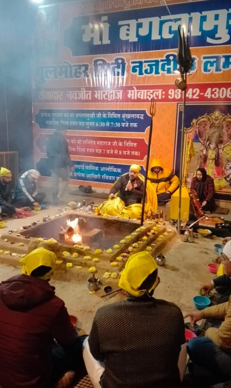 जालंधर : मां बगलामुखी धाम गुलमोहर सिटी नजदीक लम्मां पिंड चौक में श्री शनिदेव महाराज के निमित्त श्रृंखलाबद्ध हवन यज्ञ का आयोजन मंदिर परिसर में किया गया। सर्व प्रथम मुख्य यजमानो पूनम प्रभाकर एवं रिंकू सैनी से वैदिक रीति अनुसार गौरी गणेश, नवग्रह, पंचोपचार, षोडशोपचार, कलश, पूजन उपरांत ब्राह्मणों ने आए हुए सभी भक्तों से हवन-यज्ञ में आहुतियां डलवाई । इस सप्ताह श्री शनिदेव महाराज के जाप उपरांत मां बगलामुखी जी के निमित्त भी माला मंत्र जाप एवं हवन यज्ञ में विशेष रूप आहुतियां डाली गई। हवन-यज्ञ की पूर्णाहुति के उपरांत नवजीत भारद्वाज ने आए हुए भक्तों से रामचरित मानस के दोहे का सुमरिन करते हुए कहा कि