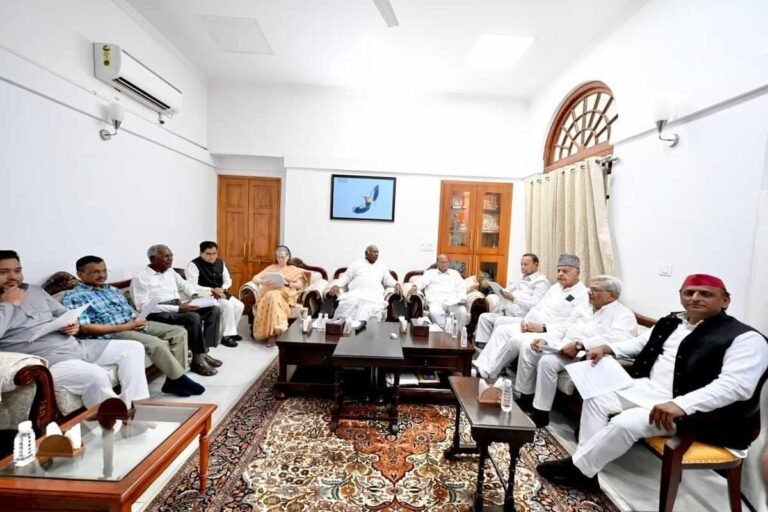 दिल्ली : लोकसभा चुनाव के लिए आखिरी चरण का मतदान होने के पहले ही इस बीच इंडिया गठबंधन की नई दिल्ली में बैठक हुई. यह बैठक लोकसभा चुनाव के नतीजे घोषित होने के बाद आगे की रणनीति पर चर्चा के लिए बुलाई गई है. बैठक कांग्रेस प्रमुख मल्लिकार्जुन खरगे के आवास पर चल रही है. बैठक में TMC को छोड़कर बाकी सभी दल के नेता शामिल हैं.इंडिया गठबंधन की बैठक कांग्रेस प्रमुख मल्लिकार्जुन खरगे के आवास पर हुई. बैठक में दिल्ली के मुख्यमंत्री अरविंद केजरीवाल, बिहार के पूर्व उपमुख्यमंत्री तेजस्वी यादव, पंजाब के सीएम भगवंत मान, आप सांसद संजय सिंह और समाजवादी पार्टी के नेता अखिलेश यादव समेत विपक्षी गठबंधन के सभी प्रमुख शामिल हुए.