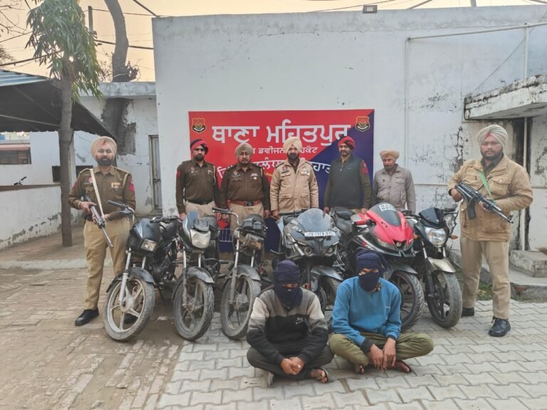 जालंधर : देहात पुलिस ने एक अंतर-जिला मोटरसाइकिल चोरी गिरोह का भंडाफोड़ किया है, जिसके दो सदस्यों को गिरफ्तार किया गया है और छह चोरी की मोटरसाइकिलें बरामद की गई हैं। जानकारी देते हुए हुए वरिष्ठ पुलिस अधीक्षक हरकमल प्रीत सिंह खख ने बताया कि रायपुर अराईयां निवासी सुरजीत सिंह द्वारा 7 जनवरी 2025 को अपनी काली स्प्लेंडर प्लस मोटरसाइकिल चोरी होने की शिकायत दर्ज कराए जाने के बाद यह कार्रवाई की गई। पुलिस स्टेशन मेहतपुर में दर्ज एफआईआर के आधार पर डीएसपी शाहकोट ओंकार सिंह बराड़ और इंस्पेक्टर सुखदेव सिंह, एसएचओ मेहतपुर की निगरानी में पुलिस टीम ने गहन जांच की।पूछताछ के दौरान आरोपियों ने विभिन्न जिलों में कई मोटरसाइकिल चोरी में अपनी संलिप्तता का खुलासा किया। जांच में छह चोरी की मोटरसाइकिलें बरामद हुईं, जिनमें यामाहा आर-15 और बजाज पल्सर जैसे हाई-एंड मॉडल शामिल हैं। आरोपी विभिन्न जिलों में लावारिस वाहनों को निशाना बनाते थे और उन्हें अलग-अलग इलाकों में बेचने से पहले उनकी पहचान बदल देते थे। दोनों आरोपियों का आपराधिक इतिहास रहा है और वे पहले भी इसी तरह की चोरी की वारदातों में शामिल रहे हैं। फरार तीसरे साथी बूटा सिंह को पकड़ने के प्रयास जारी हैं।गिरफ्तार आरोपियों की पहचान संदीप सिंह उर्फ सोनी और तरजिंदर सिंह उर्फ काका के रूप में हुई है।