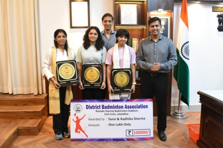 जालंधर : डिप्टी कमिश्नर डा. हिमांशु अग्रवाल ने आज यहां ज़िला बैडमिंटन संघ द्वारा राष्ट्रीय और वैश्विक स्तर पर बैडमिंटन में पंजाब का नाम रोशन करने वाली दो बहनों तन्वी शर्मा और राधिका शर्मा को एक-एक लाख रुपये का नकद पुरस्कार और ट्रॉफी देकर सम्मानित किया।