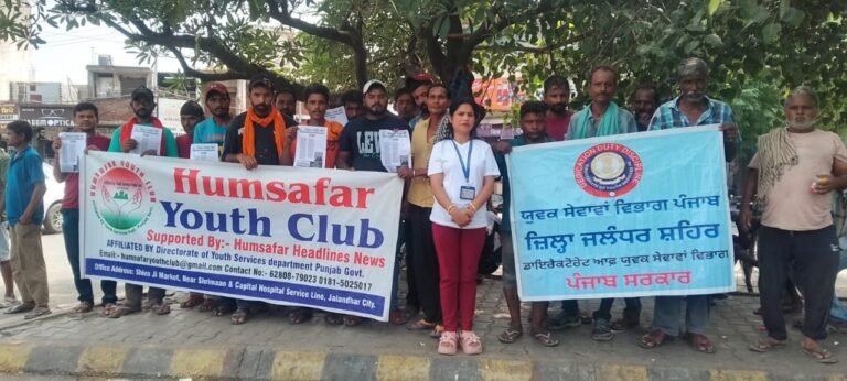 जालंधर : जिला डिप्टी कमिश्नर व जिला प्रशासन के दिशा निर्देशों अनुसार ‘युद्ध नशे विरुद्ध’ मुहिम तहत युवक सेवाएं विभाग जालंधर के सहयोग से हमसफर यूथ क्लब ने दोआबा चौक पर खड़े मजदूरों के साथ नशे के खिलाफ विशेष जागरुकता अभियान चलाया।जिसमें जिला युवक सेवाएं विभाग जालंधर व हमसफर यूथ क्लब अध्यक्ष रोहित भाटिया ने मजदूरों को नशे के खिलाफ जागरुकता के पैंम्फलेट बांटे व नशे के खिलाफ अपनी हस्त लिखित कविता के प्रदर्शन से लोगों को जागरुक भी किया।क्लब डायरैक्टर पूनम भाटिया ने मजदूरों को टी.वी., कैंसर, एच.आई.वी. जैसी भयानक बिमारियों के फैलने वाले लक्ष्णों, इलाज व परहेज के बारे में भी बताया। उन्होंने ये भी कहा कि सिवल अस्पताल में इन तीनों के टैस्ट व इलाज मुफ्त करवाएं जा सकते हैं, सिवल प्रशासन किसी भी तरह की चार्ज नहीं करता।रोहित भाटिया ने बताया कि अगर किसी को भी नशे की आदत लग चुकी हो वो हमारी संस्था के से जुड़कर नशा छुड़ाओं केंद्र द्वारा इस नंबर पर 62808-79023 मुफ्त में अपना इलाज करवा सकता है।जिसका हमसफर यूथ क्लब संपूर्ण सहयोग के साथ हर तरह से उनको जागरुक भी करेगी।