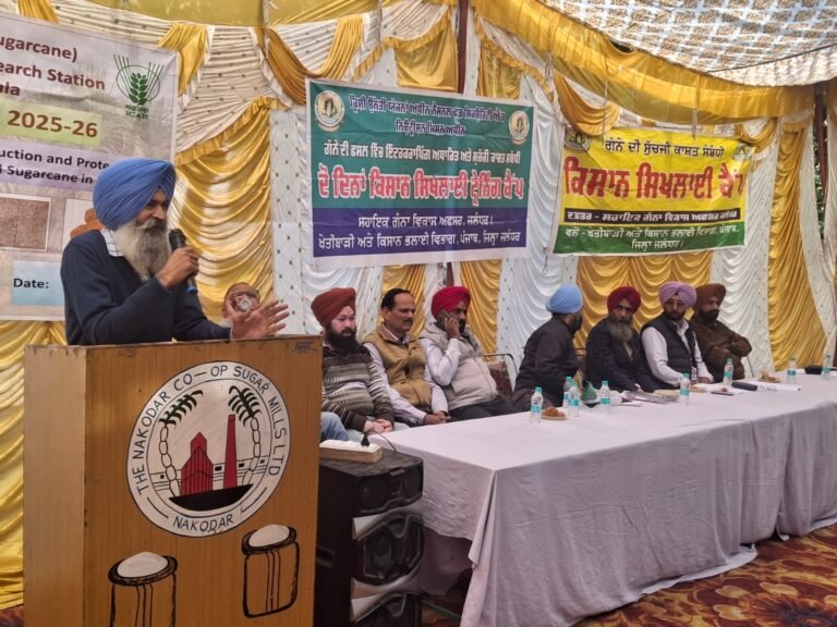 नकोदर (जालंधर) : कृषि एवं किसान कल्याण विभाग की गन्ना शाखा द्वारा उन्नत कृषि योजना के तहत सहकारी शुगर मिल नकोदर में डा. मनधीर सिंह, प्रोजेक्ट अधिकारी के नेतृत्व में गन्ने की फसल संबंधी दो दिवसीय किसान जागरूकता कैंप/प्रशिक्षण आयोजित किया गया।प्रशिक्षण के दौरान सहायक गन्ना विकास अधिकारी डा. गुरचरण सिंह, प्रधान वैज्ञानिक एवं किसान सलाहकार केंद्र जलोवाल डा. मनिंदर सिंह, कीट वैज्ञानिक डा. युवराज सिंह, फसल वैज्ञानिक तथा गन्ना अनुसंधान केंद्र कपूरथला डा. राजिंदर पाल ने गन्ने की खेती की उन्नत तकनीकों, कीट-मकोड़ों की रोकथाम, रोग प्रबंधन, गन्ने में अंतर-फसल तथा किसानों की भलाई से संबंधित विभिन्न सरकारी योजनाओं के बारे में विस्तार से जानकारी दी।किसानों को संबोधित करते हुए डा. गुरचरण सिंह ने कहा कि कृषि उन्नत योजना के तहत राष्ट्रीय खाद्य सुरक्षा एवं पोषण मिशन के अंतर्गत पंजाब सरकार द्वारा गन्ने की प्रति हेक्टेयर पैदावार बढ़ाकर पंजाब में गन्ने की फसल में अंतर-फसल के अंतर्गत क्षेत्रफल बढ़ाने के लिए प्रदर्शनी प्लॉट लगाए जा रहे है ताकि गन्ना उत्पादक किसानों की आर्थिक स्थिति मजबूत की जा सके। इसके अलावा इस मिशन का उद्देश्य फसल उत्पादन, तकनीक और बीजों के लिए सहायता प्रदान करके अनाज उत्पादन बढ़ाना, मिट्टी की सेहत बहाल करना, किसानों की आय में सुधार करना तथा पोषण सुरक्षा को बढ़ावा देना है। इस योजना के तहत कृषि एवं किसान कल्याण विभाग की गन्ना शाखा द्वारा किसानों को प्रशिक्षण दिया जा रहा है।उन्होंने कहा कि गन्ना पंजाब की गेहूं, धान और कपास के बाद चौथी ऐसी नकदी फसल है जो मौसम के प्रतिकूल प्रभावों को सहन करके भी गन्ना किसानों को अच्छी आमदनी प्रदान करती है।डा. राजिंदर पाल ने कहा कि गन्ने की प्रति हेक्टेयर पैदावार बढ़ाने के उद्देश्य से किसानों को चौड़ी पंक्ति विधि अपनाने के लिए प्रेरित किया जा रहा है। इस विधि से बोई गई गन्ने की फसल के पौधों को अधिक रोशनी और हवा मिलती है, जिससे फसल कम गिरती है और पैदावार में वृद्धि होती है।कृषि अधिकारी (प्रशिक्षण) डा. प्रवीण कुमारी ने बताया कि गन्ने की बुवाई के साथ दालों की अंतर-खेती करने से भूमि की सेहत में सुधार और उर्वरकों की बचत की जा सकती है।शुगर मिल नकोदर के महाप्रबंधक सुखविंदर सिंह तूड़ ने किसानों को बताया कि मिल में गन्ने की पेराई 28 नवंबर से शुरू की जा रही है।सी.सी.डी.ओ. एकम सिंह सिद्धू ने अंत में दो दिवसीय प्रशिक्षण में आए सभी किसानों का धन्यवाद किया।