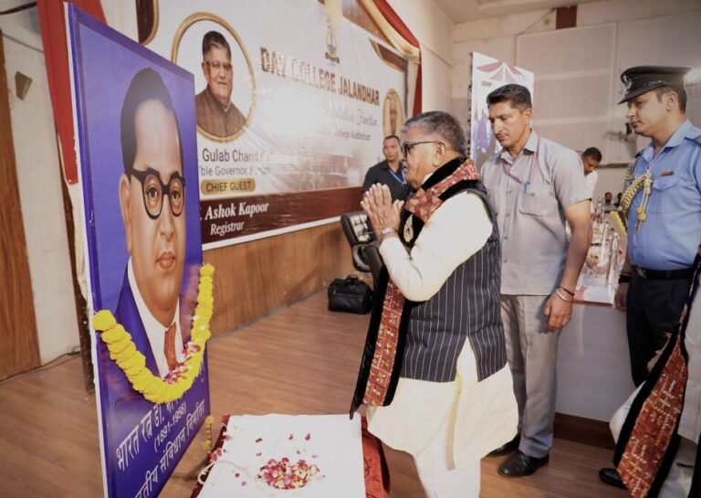 जालंधर : पंजाब के राज्यपाल श्री गुलाब चंद कटारिया ने आज यहां डी.ए.वी. कॉलेज के 90वें पुरस्कार वितरण समारोह के दौरान संबोधित करते हुए विद्यार्थियों को शिक्षा प्राप्त करके देश को विकसित बनाने में सक्रिय योगदान देने का आह्वान किया।समारोह की शुरुआत में राज्यपाल गुलाब चंद कटारिया ने देश के संविधान निर्माता बाबा साहेब डा. बी.आर. आंबेडकर जी को उनके जन्म दिवस के अवसर पर श्रद्धांजलि अर्पित की।