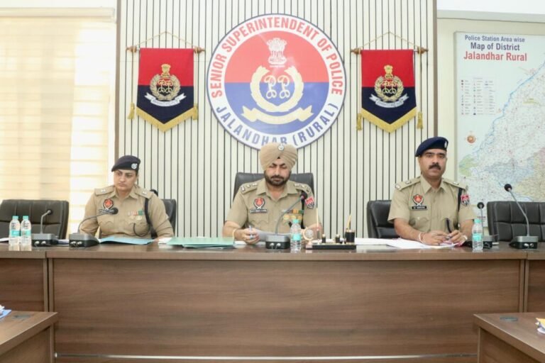 जालंधर : देहात में कानून-व्यवस्था की स्थिति का जायजा लेने और आपराधिक गतिविधियों के विरुद्ध कार्रवाई को और मजबूत करने के लिए स. हरविंदर सिंह विरक, एस.एस.पी., जालंधर ग्रामीण की अगुवाई में जिला पुलिस अधिकारियों की एक महत्वपूर्ण बैठक आयोजित की गई। इस बैठक में मुकेश कुमार, एस.पी. (मुख्यालय), मनजीत कौर, एस.पी. (पीबीआई) सहित सभी डीएसपी, एसएचओ, पुलिस चौकी इंचार्ज और अन्य जिला अधिकारी शामिल हुए।बैठक के दौरान नशा तस्करी और गैंगस्टर नेटवर्क के खिलाफ चल रही कार्रवाइयों की विस्तार से समीक्षा की गई। आने वाले समय के लिए रणनीतियां भी तय की गईं, ताकि यह अभियान और अधिक प्रभावी एवं परिणाम-केंद्रित बनाया जा सके।