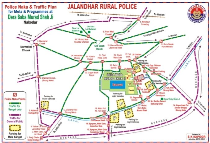 जालंधर : देहात पुलिस द्वारा डेरा बाबा मुराद शाह जी, नकोदर में आयोजित होने वाले मेले एवं धार्मिक कार्यक्रमों के दौरान भारी भीड़ को ध्यान में रखते हुए यातायात के सुचारू प्रबंधन, जन सुरक्षा तथा आवागमन को व्यवस्थित बनाए रखने हेतु विशेष यातायात योजना लागू की गई है।इस योजना के अंतर्गत विभिन्न स्थानों पर पुलिस नाके (N Points) एवं मजबूत नाके (Strong Nakas) स्थापित किए गए हैं तथा वाहनों की आवाजाही के लिए निम्नलिखित मार्ग निर्धारित किए गए हैं: