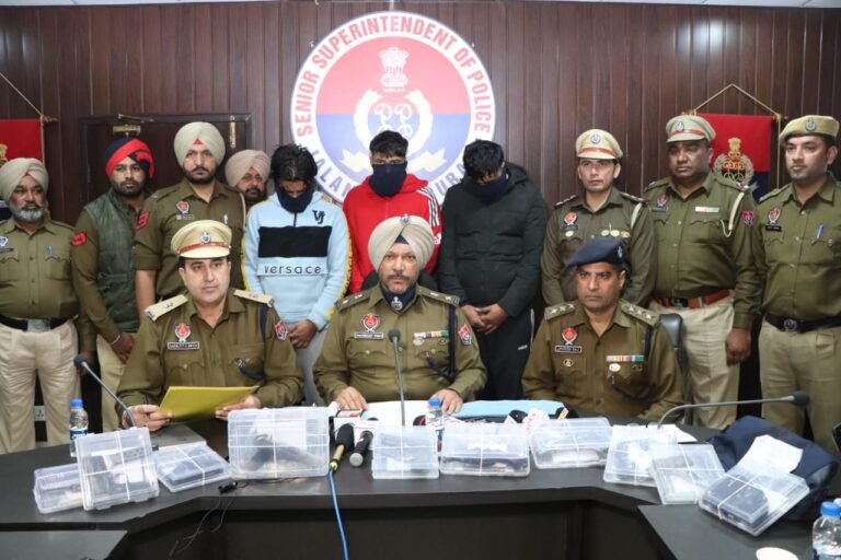 जालंधर ( एस के वर्मा ): गैंगस्टरों के खिलाफ चलाई गई मुहिम के तहत थाना फिल्लौर की पुलिस ने बड़ी कामयाबी हासिल की है। देहात के एसएसपी स्वर्णदीप सिंह के निर्देशों पर चलाई गई विशेष मुहिम के तहत पुलिस कप्तान इनवेस्टीगेशन सरबजीत सिंह बाहिया की अगुवाई में फिल्लौर थानां के इस्पेक्टर सुरिंदर कुमार ने टीम सहित गैंगस्टर लखबीर लंडा गैंग के 3 सदस्यों को गिफ्तार हथियारों सहित गिरफ्तार किया है। पुलिस ने आरोपियों से 7 पिस्तौल सहित मैगजीन, 30 जिंदा रौंद, 1 रिवालवर .32 बोर सहित 5 जिंदा रौंद, 1 पिस्तौल 315 बोर सहित 2 जिंदा रौद और आई-20 कार बरामद की है।प्रेस कॉन्फ्रेंस में जानकारी देते हुए एसएसपी स्वर्णदीप सिंह ने बताया कि कल को देहात थाने के इस्पेक्टर सुरिंदर कुमार की टीम ने पुख्ता जानकारी के आधार पर लखबीर लंडा गैंग के 3 सदस्यों को काबू किया है। पकड़े गए आरोपियों की पहचान लवप्रीत सिंह उर्फ लाडी पुत्र शेर सिंह निवासी भोजला थाना तड़शंकर, गगनदीप सिंह उर्फ गगन पुत्र लंबर सिंह निवासी मोहल्ला रणजीतपुरा गांव तलहन थाना बिलगा, सुखविंदर सिंह उर्फ सुक्खा पुत्र जग्गा सिंह निवासी जंगवाड़ थाना गोराया के रूप में हुई है।पकड़े गए आरोपियों पर देहात पुलिस ने 5 दिन का रिमांड हासिल किया गया है बातचीत करते हुए एसएसपी स्वर्णदीप सिंह ने कहा कि बहुत जल्द पकड़े गए आरोपियों के जेल से चल रहे करेक्शन का व्यक्तियो को जालन्धर में लाया जा सकता है