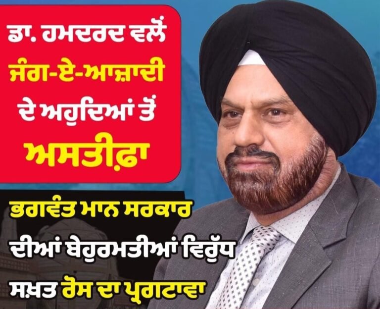 जालंधर ( एस के वर्मा ) : महानगर से बड़ी खबर सामने आई है। अखबार के मालिक ने जंग-ए-आजादी के पद से इस्तीफा दे दिया है। मामले की जानकारी अकाली दल के सीनियर नेता दलजीत चीमा ने दी है। इस दौरान अखबार के मालिक ने कहा कि जंग-ए-आजादी मेमोरियल फाउंडेशन के सदस्य-सचिव और मेमोरियल की प्रबंध समिति के अध्यक्ष डॉ. बरजिंदर सिंह हमदर्द ने भगवंत मान के नेतृत्व वाली आम आदमी पार्टी सरकार के जंग-ए-आजादी स्मारक के प्रति दुर्व्यवहार और तथाकथित जांच के नाम पर बार-बार पुलिस भेजकर पंजाब के शहीदों और स्वतंत्रता सेनानियों जिनकी याद में यह यादगार उसारी की गई है, उसके अपमान करने के रोष में अपने दोनों पद से इस्तीफा दे दिया है।